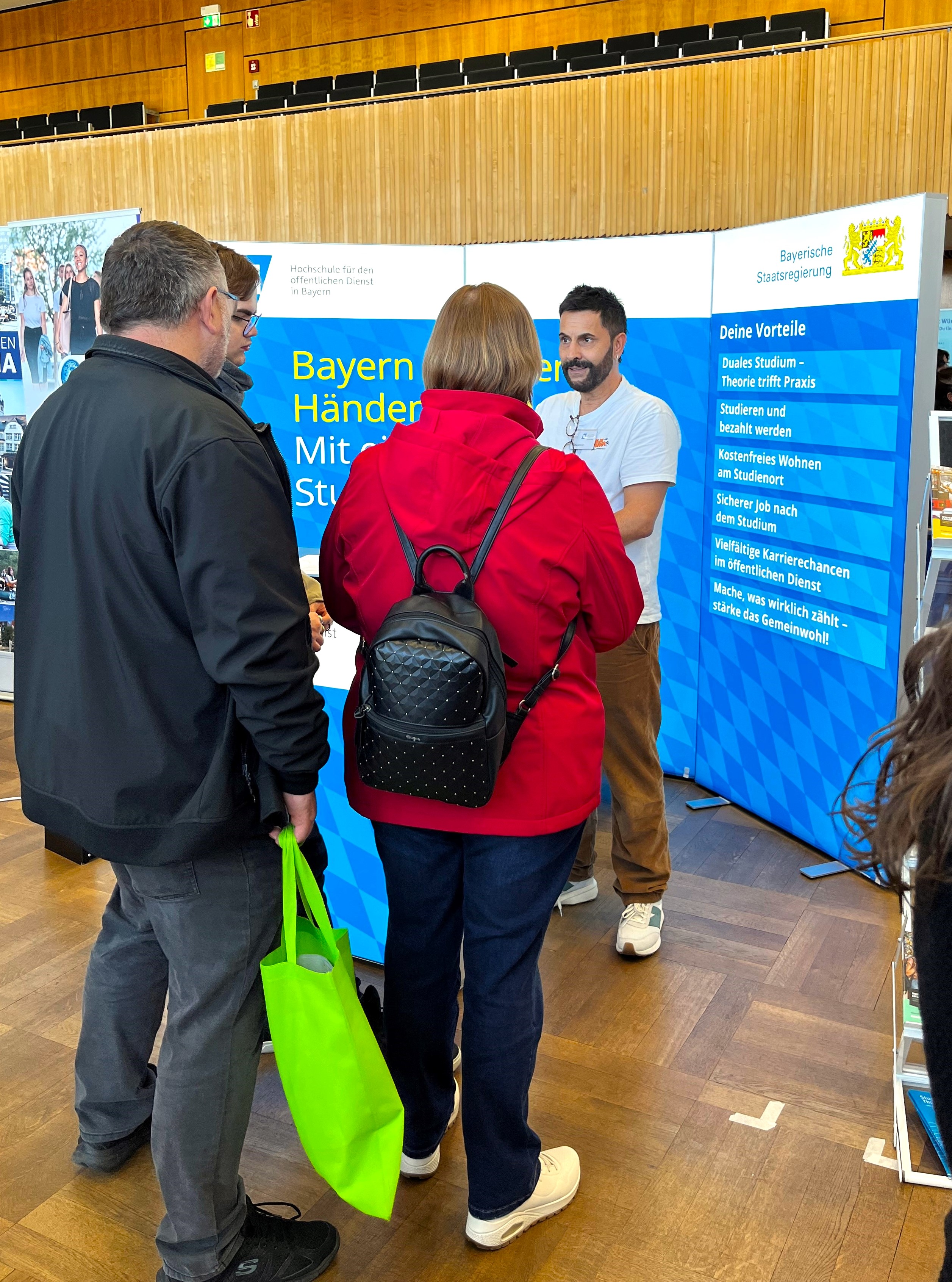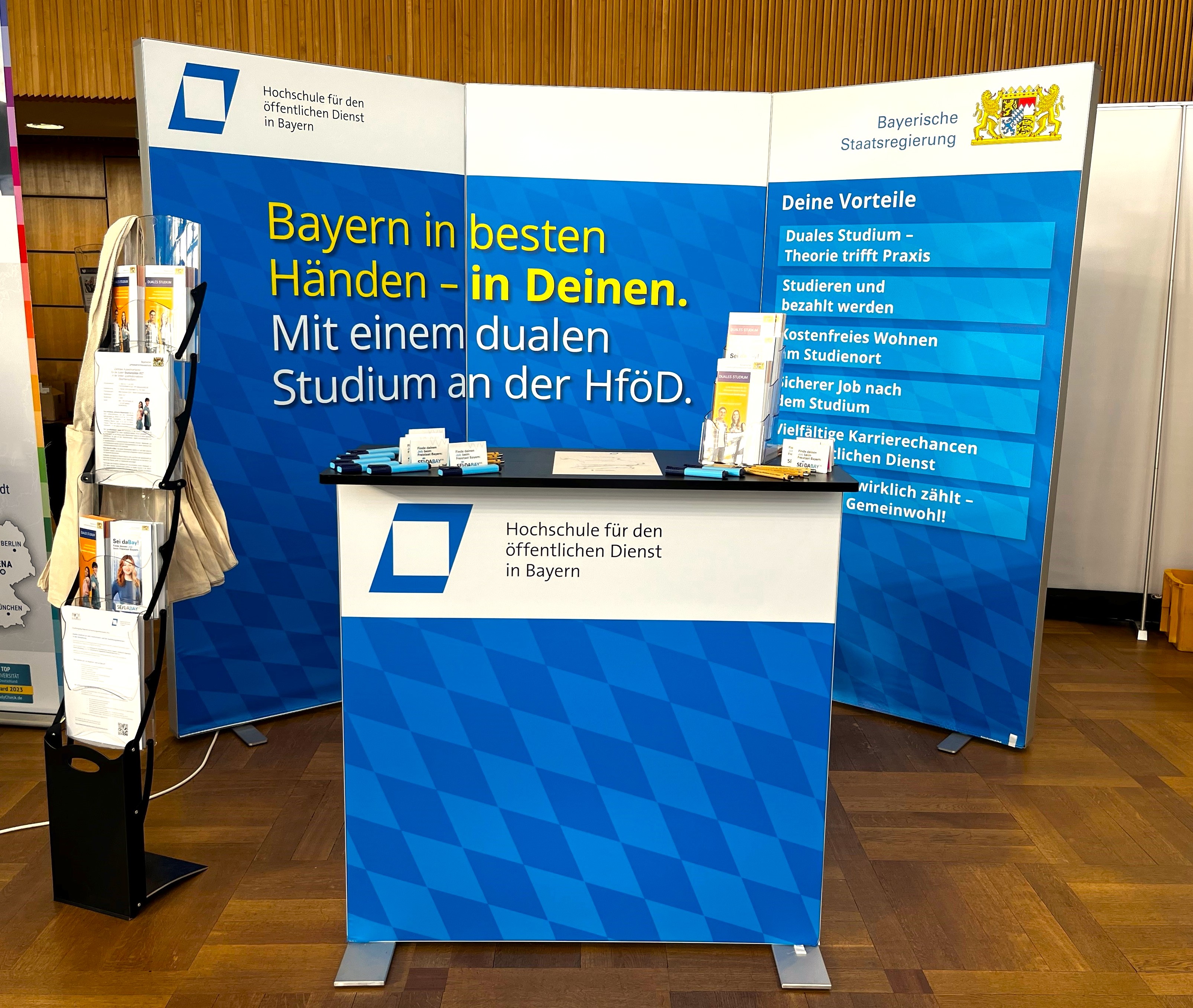 Die HföD war 2025 zum ersten Mal eigenständig auf Berufs- und Studienmessen vertreten. In ganz Bayern haben wir mit euch über unser vielfältiges Studienangebot sprechen können. Gerne haben wir euch auf das bunte, finanziell attraktive und abwechslungsreiche duale Studium beim Staat neugierig gemacht. Dabei haben wir auch viel über euch und die unterschiedlichen Regionen in unserem schönen Freistaat Bayern gelernt. Vielen Dank für all die offenen Gespräche und euer Interesse an einer sinnstiftenden Karriere im öffentlichen Dienst!